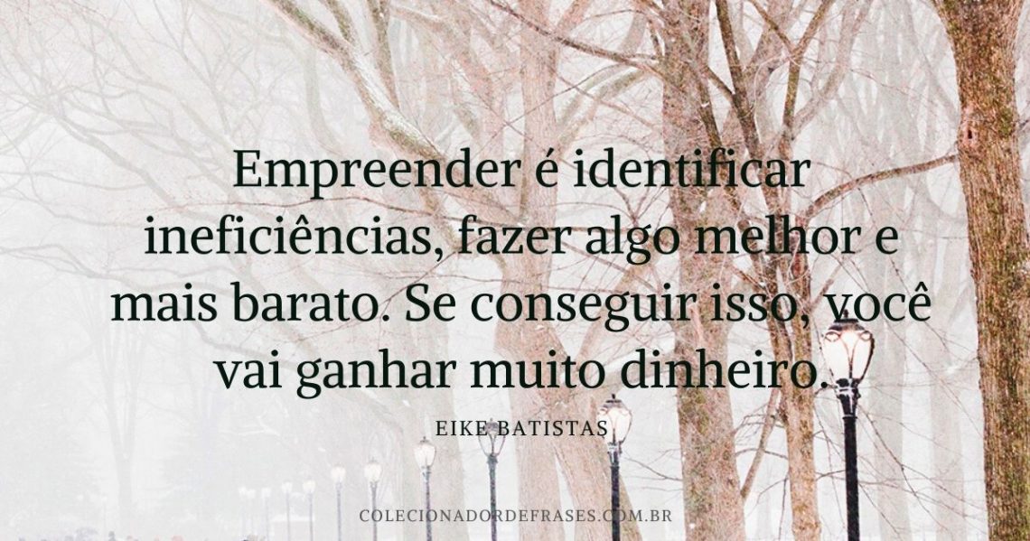 Eike Batistas, Frases Inspiradoras Empreender é identificar ineficiências, fazer algo melhor e mais barato. Se conseguir isso, você vai ganhar muito dinheiro. 4 de fevereiro de 2015 / Visualizações: 634